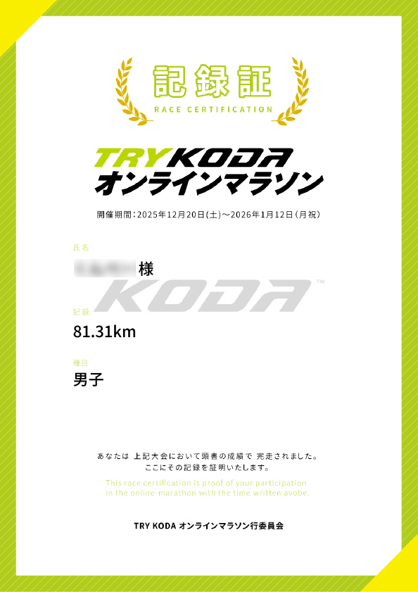 ・大会名:TRY KODA オンラインマラソン